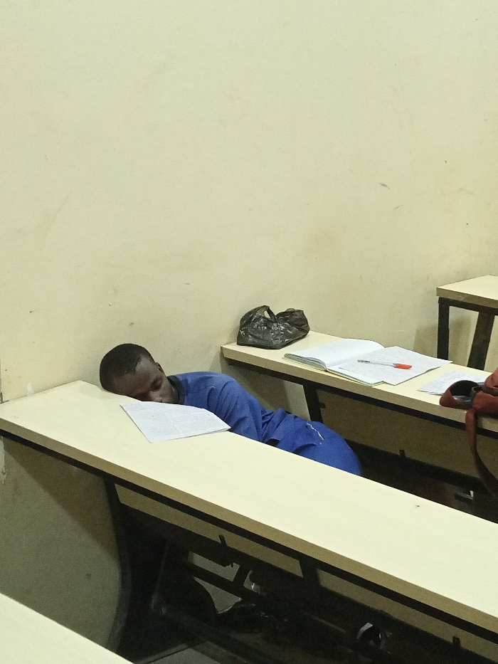 A student in a blue shirt is asleep on a school desk with a sheet of paper under his head. Behind him is another desk with an open notebook, a pen, a dark plastic bag, and a red bag. The desks have light-colored tops with dark edging, and are on metal frames. The wall is plain, light yellow, and slightly mottled.