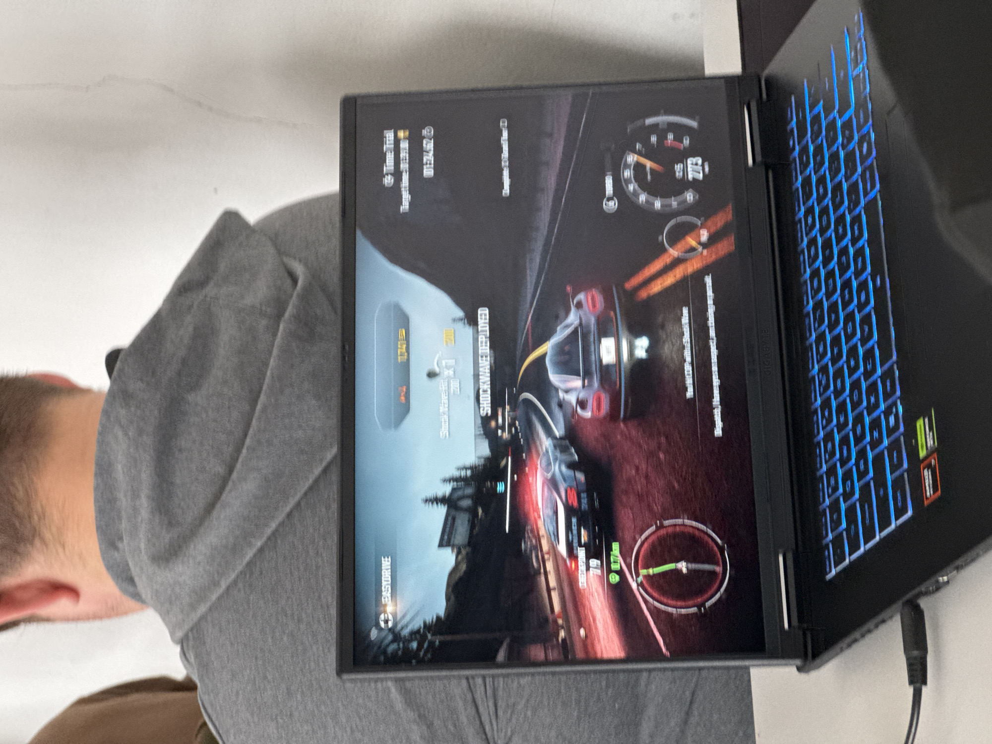 The scene, located in the city of Plovdiv, Bulgaria, depicts an indoor environment. A black gaming laptop with an open lid is positioned prominently on a light-colored table surface. The laptop's screen displays a racing video game, "Need for Speed: Most Wanted," featuring two high-performance cars, one of which is a police interceptor with active red and blue lights, racing on a multi-lane highway through a mountainous, forested landscape. The in-game interface indicates a "Time Trial" mode with a current speed of 273 km/h. The laptop's keyboard is actively illuminated with blue backlighting, and a black power cable is connected to its left side. In the background, the back of a person wearing a grey hooded sweatshirt is visible, facing away from the camera. A partial view of a second person or object in brown attire is visible to the far left. The wall in the background is white, showing faint vertical streaks.