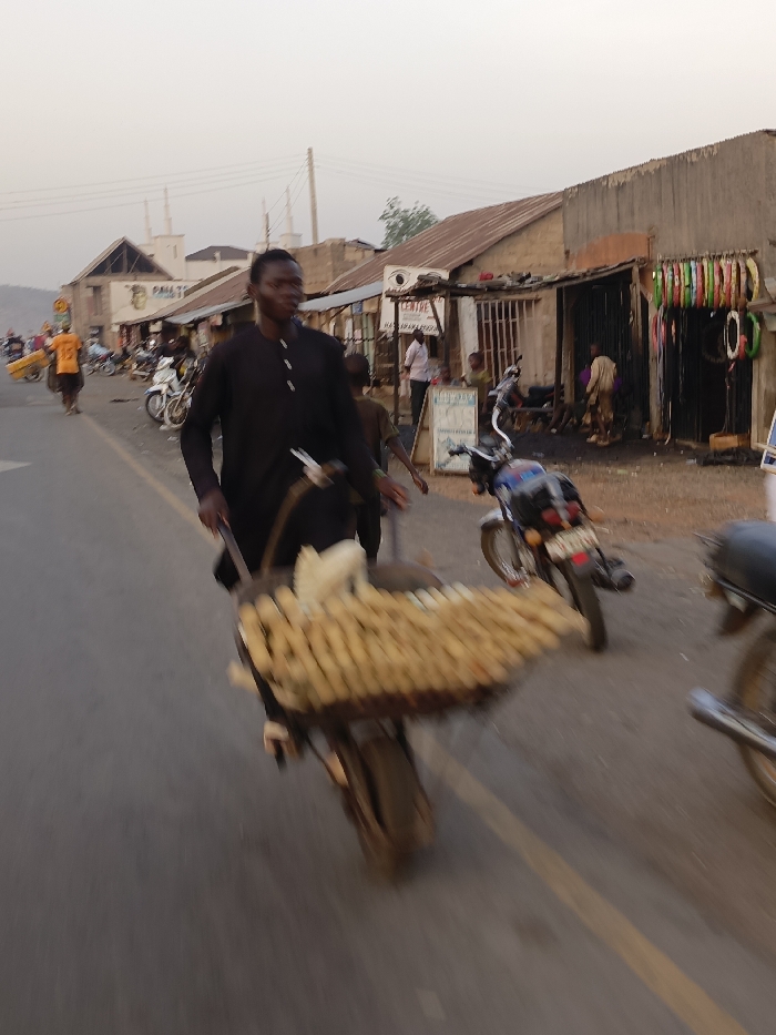 A man walks along a street pushing a wheelbarrow overflowing with corn. The man wears dark clothing. The background features a mix of buildings, including a church and shops, along with several motorcycles. The street appears to be in a busy, possibly rural or developing area. The image is slightly blurry, suggesting motion.