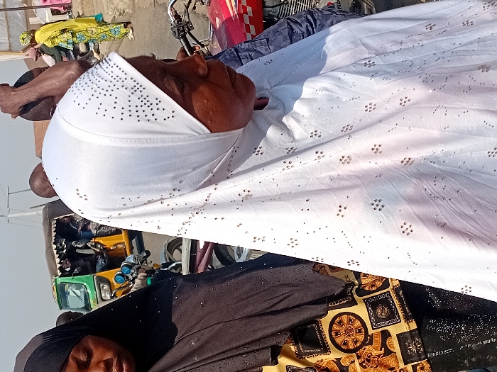 Two women wearing hijabs are visible. One woman wears a white hijab with small metallic embellishments. The other woman wears a black hijab with dark embellishments and patterned gold and black fabric below. A motorized tricycle, motorbikes, and multiple people are in the background, suggesting a public space.