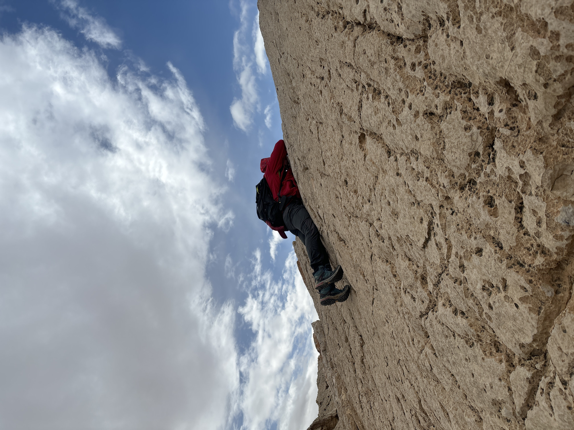 The image captures a lone individual ascending a steep, light brown, heavily fractured rock face in the Arava Tichona Regional Council, Israel. The rock surface exhibits numerous small, irregular pockmarks and extensive cracking. The person is positioned prone, oriented upwards along the incline, wearing dark-colored trousers, a bright red hooded jacket, and a black backpack. Dark green and black hiking boots are visible, with their soles in contact with the rock. The sky above transitions from clear blue with scattered white cumulus clouds on the right to a more overcast, grey cloud formation on the upper left. Distant, indistinct rocky formations are visible on the horizon in the upper left background.