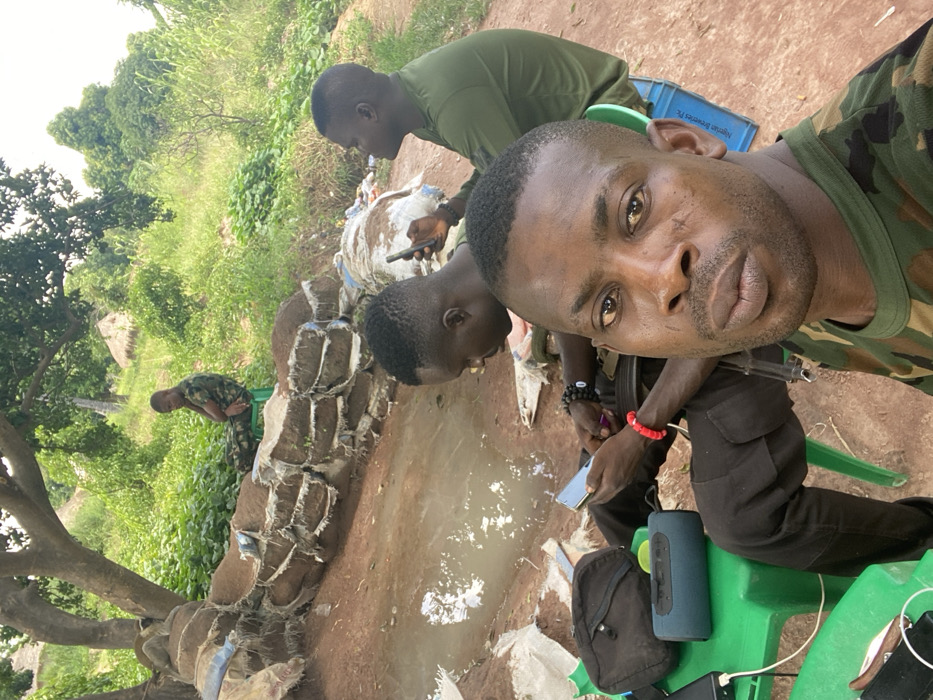 This image depicts an outdoor scene in Zaki Biyem, Nigeria, featuring four adult males in a semi-rural environment