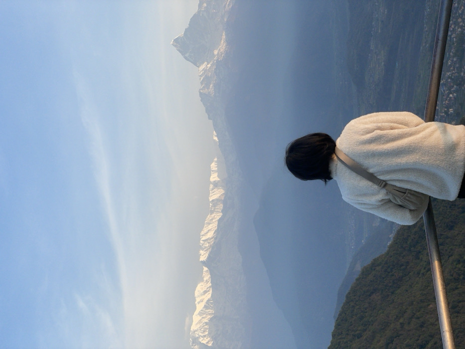 The image depicts a panoramic view from an elevated vantage point in Pokhara, Nepal, likely a popular viewpoint overlooking the city and the Himalayas. A single individual is positioned in the foreground, seen from behind, facing the distant mountain range. This person has short, dark hair and wears an off-white, textured fleece jacket with a light-colored cross-body bag strap visible over their right shoulder. They are leaning against or standing immediately behind a horizontal metal railing that extends across the lower portion of the frame. To the left of the person and below the railing, a steep, green hillside covered in dense foliage is visible. Beyond this, the midground consists of multiple layers of mountains appearing progressively lighter and bluer due to atmospheric haze, with a valley containing visible urban development below. In the far background, the snow-capped peaks of the Annapurna mountain range are prominent. Specifically, the distinct, sharply pointed summit of Machapuchare (Fishtail Mountain) is clearly visible on the right side of the range. The sky above is a clear, light blue with faint, wispy cloud formations. The lighting suggests either early morning or late afternoon, casting a soft glow on the snow-capped peaks.