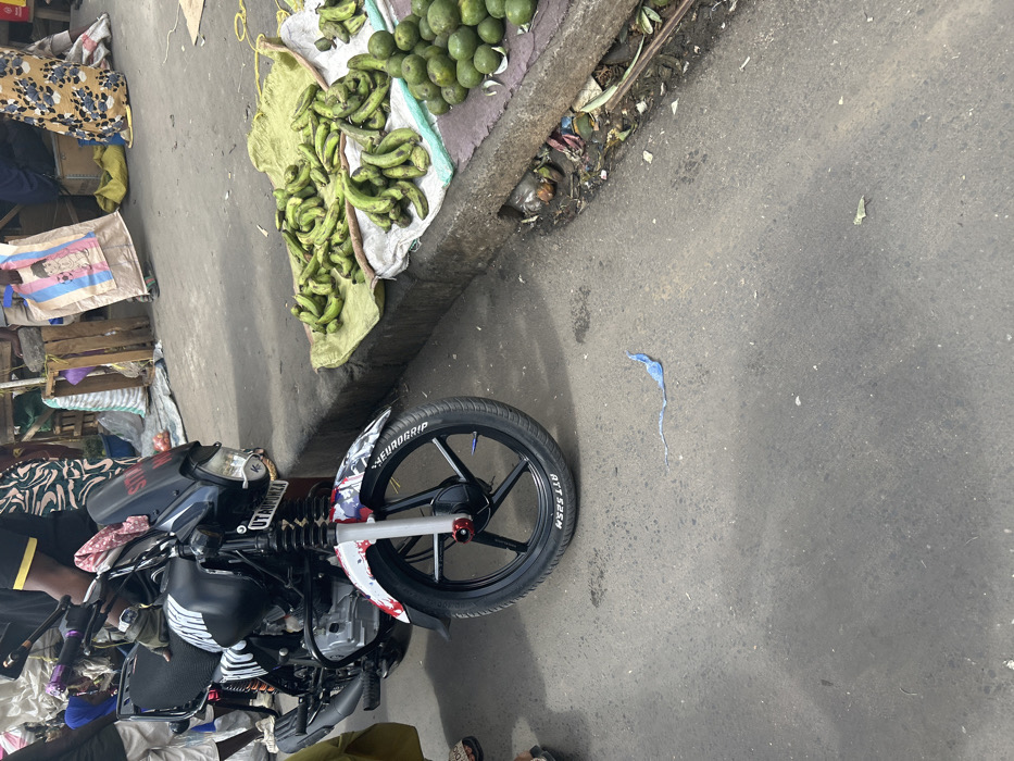 A partially visible motorbike stands on pavement adjacent to a market display of plantains and green mangos. Vendors and buyers are present. A blue ribbon-like object is on the pavement. The image is rotated.
