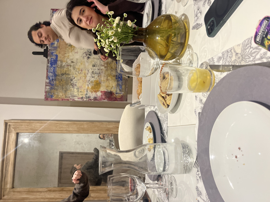 A table is set for a meal with a patterned tablecloth. A centerpiece of flowers in a brown vase sits beside a glass of yellow liquid. Plates are arranged with gray placemats. Two people, a male and a female, are leaning into the frame. An abstract painting hangs on the wall behind them. A large mirror is visible, reflecting another person. The table setting is indoors.