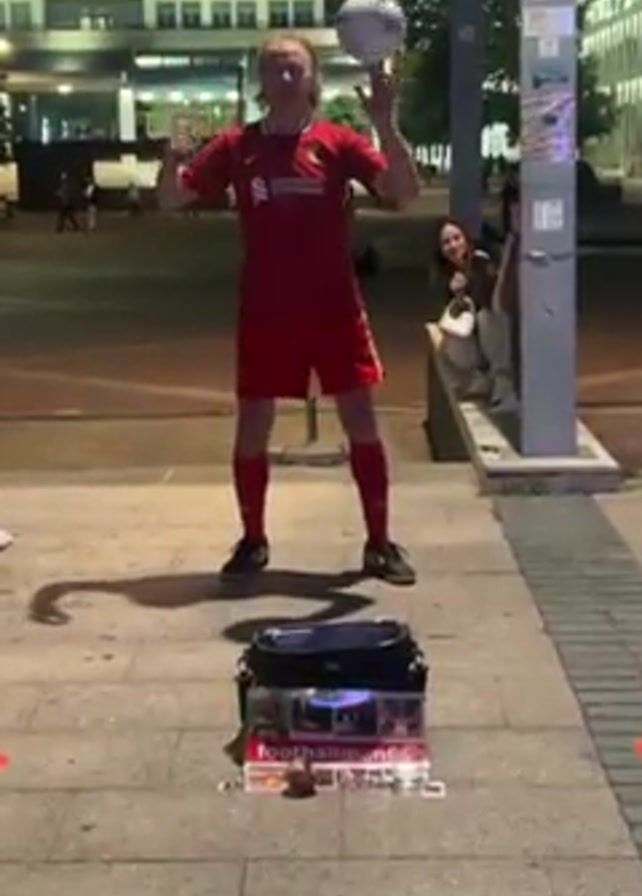 In an outdoor setting, likely an urban plaza, a street performer dressed in a full red Liverpool FC uniform, including shorts and socks, expertly balances a soccer ball on his index finger