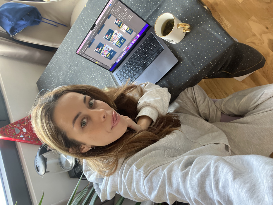 A woman with light brown hair and green eyes is seated indoors at a table, taking a selfie in the City of Bar, Montenegro. She wears a light grey hooded sweatshirt and matching sweatpants. Her right hand rests under her chin, and her tongue is slightly extended. On the dark grey tablecloth with white polka dots, a silver laptop is open, displaying design software with multiple graphical layouts. A white ceramic mug with a gold rim and handle, containing a green liquid, sits beside the laptop. In the background to the left, a green plant, a glass electric kettle, and a red pyramidal box labeled "English Tea" are visible near a window. To the right, a light-colored chair has a blue hooded garment draped over it. The floor is light-colored wood.