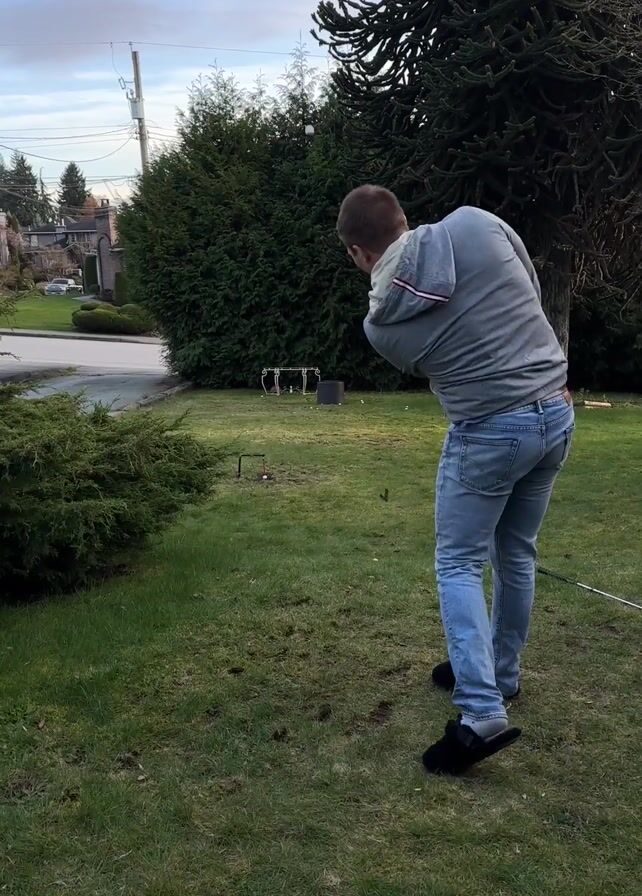A man is playing golf in a yard