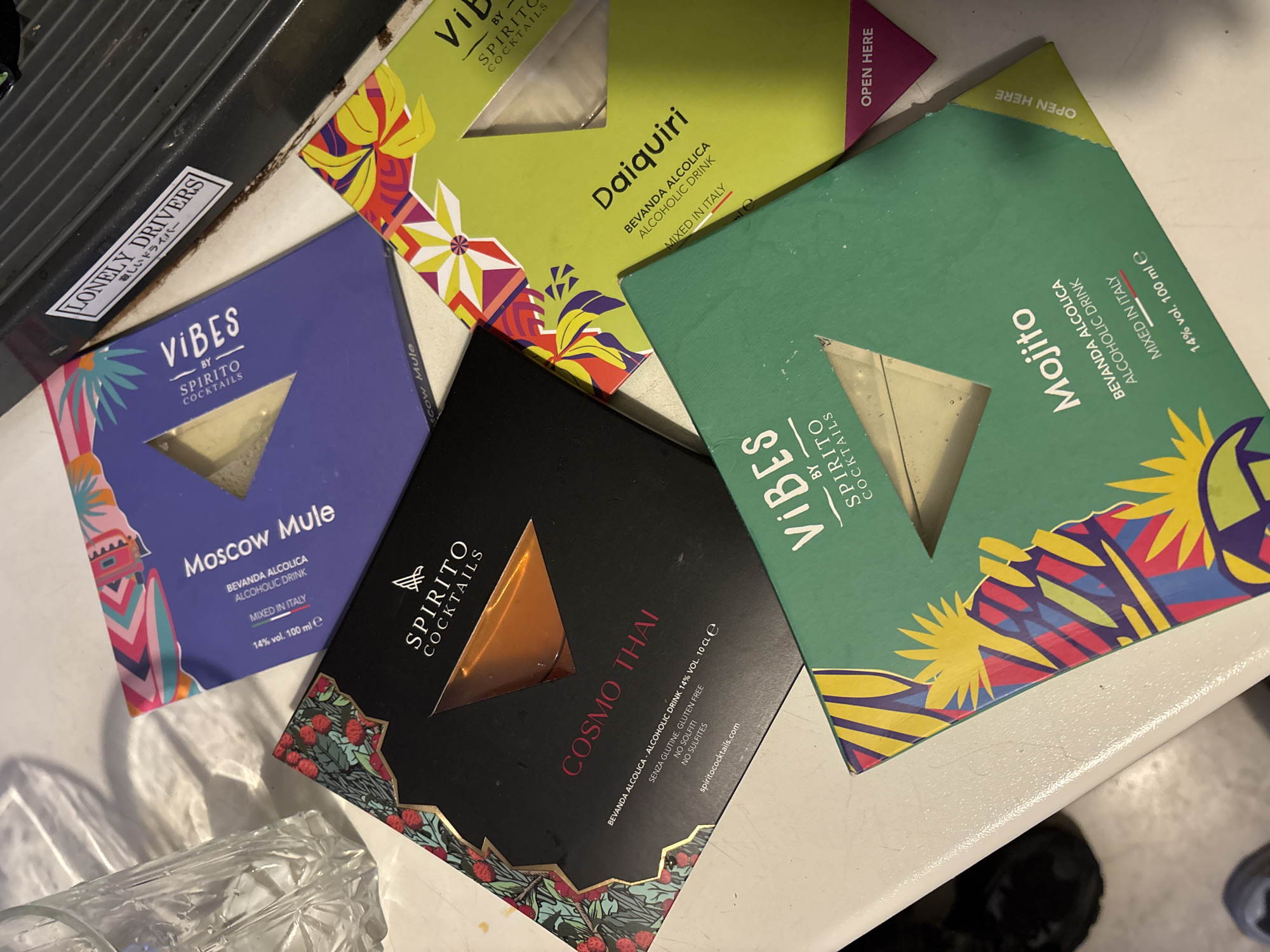 close-up of four different varieties of "Vibes by Spirito Cocktails" pre-mixed alcoholic drinks arranged on a white surface. From left to right, they are: Moscow Mule, Cosmo Thai, Daiquiri, and Mojito. Each drink is packaged in a flat, square box with a triangular cutout revealing the liquid inside. The boxes have colorful, abstract designs and text indicating the drink name, that they are mixed in Italy, and the alcohol volume (14%). The Cosmo Thai box also indicates "Senza Glutine" (Gluten Free) and "No Solfiti" (No Sulfites). The Moscow Mule box has "Scow Mule" written next to it. On the left edge of the image, part of a dark, metal object is visible with a sticker that says "Lonely Drivers". In the lower right is some kind of black object. The surface is presumed to be in Sofia, Bulgaria, due to the image request originating from there.