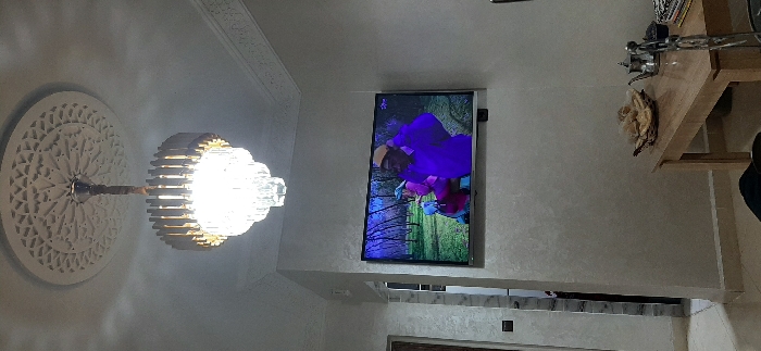 This image depicts an interior residential space located in Meknes, Morocco. A bright, multi-tiered chandelier with a chrome frame and clear glass or crystal elements hangs centrally from a white ceiling. The chandelier is surrounded by a circular, ornate ceiling medallion featuring geometric openwork patterns. Below, a flat-screen television is wall-mounted on a light grey, textured wall. The television displays a program featuring a man in a purple traditional garment and yellow cap, facing right, with another individual in a pink and blue outfit partially visible behind him. The on-screen background is an outdoor scene with trees and green foliage; a "2M" channel logo is visible in the upper right corner of the screen. In the lower right foreground, a light wooden rectangular table is present, bearing a woven basket filled with light-colored bread or pastries, a silver traditional Moroccan teapot with an ornate handle, and a stack of books or magazines. A dark fabric, likely from seating, is visible in the bottom center, and a metal chair part is visible on the far right edge. A light-colored tiled floor extends towards an open doorway on the left, near which a dark square wall switch or outlet is mounted. White decorative crown molding runs along the top of the walls.