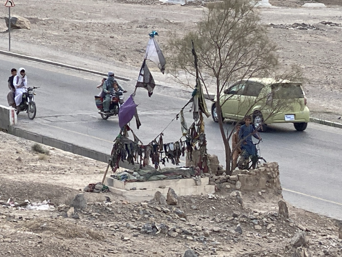 A roadside shrine with flags and cloth adornments stands prominently. Two boys on bicycles are positioned near the shrine with a green car parked on the road behind them. Two motorcycles carrying multiple passengers travel on the road beside the shrine. The landscape is arid and rocky, with a road separating the shrine and the vehicles from the surrounding terrain.
