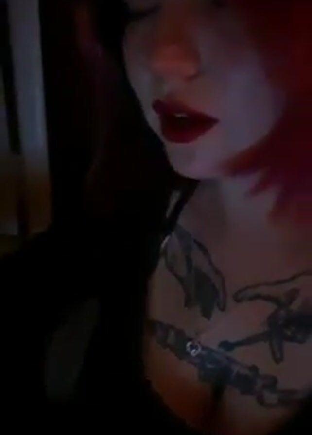 A close-up video shows a woman with red hair, fair skin, and dark red lipstick. She is wearing a low-cut black top. A tattoo depicting hands reaching toward each other is visible on her chest. She is singing or mouthing the lyrics to a song. The background is dark and indistinct.