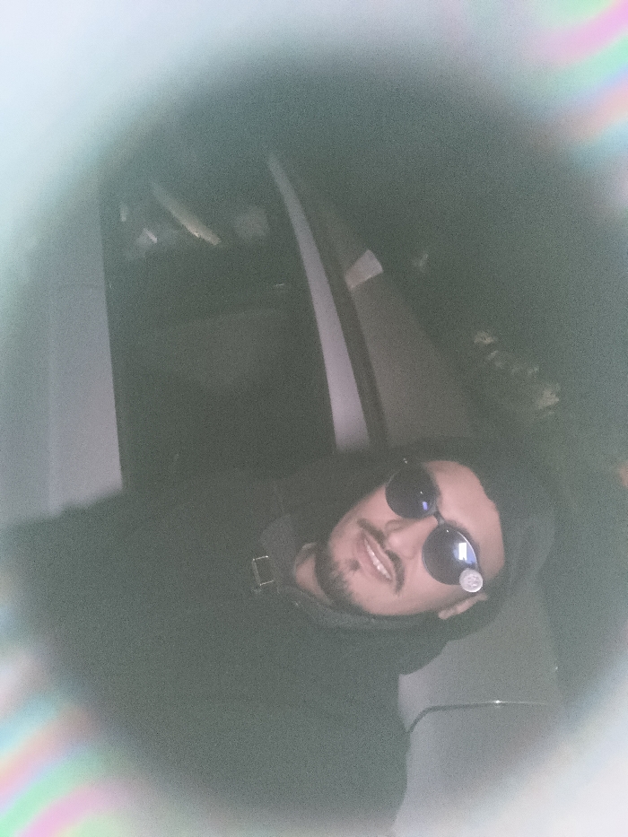 The image, rotated approximately 90 degrees counter-clockwise, depicts a male individual in a low-light, grainy, and out-of-focus scene with significant lens flare, including a circular vignette and rainbow chromatic aberrations. The male subject has a dark beard and mustache, is smiling with visible upper teeth, and wears dark, round-lensed sunglasses with a small white sticker or label affixed to the right lens. He is dressed in a dark hooded garment featuring a metallic buckle or clip on the left chest area. The background is dark and indistinct, suggesting an enclosed interior space with subtle vertical and diagonal structural elements, possibly a vehicle or room. While the location is stated as Meknes, Morocco, no specific visual identifiers within the image confirm this geographical detail. The individual is directly facing the camera.