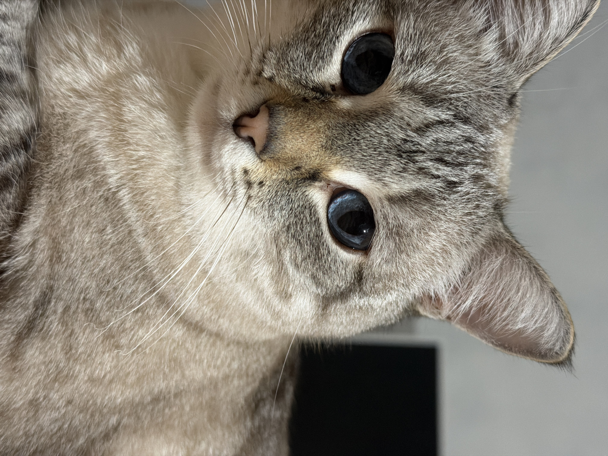 A close-up, upside-down perspective shows a grey tabby cat with light fur, focused intently on the camera