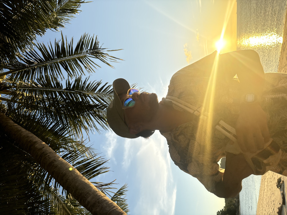 The image depicts an adult male standing on a sandy beach at sunset in Ban Ko Li Pe, Thailand. The man, seen from the waist up in profile facing right, wears a light-colored, patterned short-sleeved shirt, a khaki baseball cap, and light-framed sunglasses with reflective blue lenses. He has a beard and a dark digital watch on his left wrist. A light-colored strap is visible across his chest. He stands with his left hand on his hip, looking towards the horizon where a bright, intense sun sets over the ocean, casting a strong golden glare across the water. A lens flare emanates from the sun, heavily backlighting the man and creating a silhouette effect. Overhead, large palm fronds and a palm tree trunk are visible on the left, silhouetted against a clear blue sky with sparse clouds. The immediate foreground shows sandy beach with small dark objects, possibly debris. Distant land is faintly visible on the left horizon of the ocean.