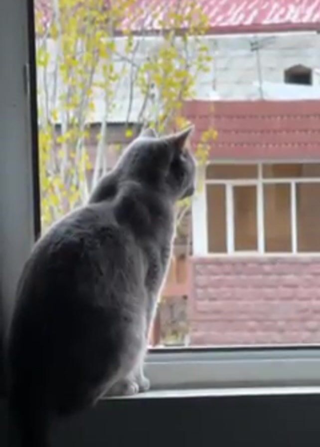 A gray cat is sitting on a white windowsill, looking out an open window. The cat has its back to the camera. Outside, there is a view of buildings and trees. The weather appears to be overcast.