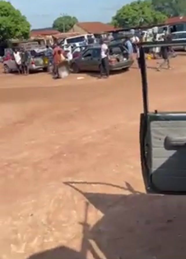 rmed personnel standing in the back of a utility truck in what appears to be a crowded open area. In the first shot, the person is standing near the open passenger door. The camera then moves to show an AK-47 assault rifle in the truck bed. The person carrying the camera gets out of the truck holding another AK-47 and shows more of the open field, which contains cars, buildings, and people.