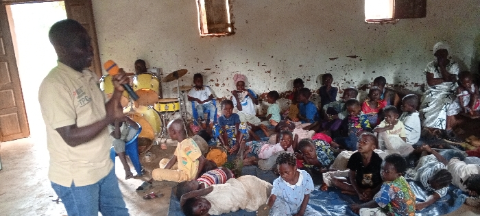 The image depicts an indoor gathering in Konongo, Democratic Republic of the Congo