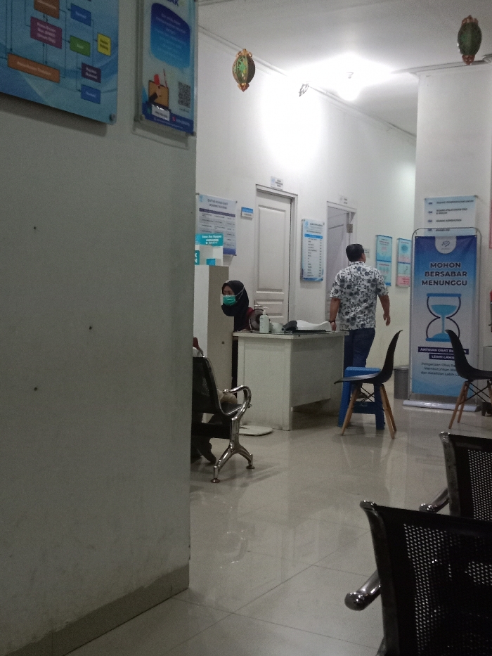 waiting area in a building in Kecamatan Kaliwungu Selatan, Indonesia (latitude: -6.964, longitude: 110.247). A man in a white and black shirt, blue jeans, and flip flops is standing by a desk. A woman wearing a black headscarf and a green face mask is sitting behind the desk. There are several chairs in the waiting area. A sign with the words "MOHON BERSABAR MENUNGGU" ("Please be patient while waiting") is visible on the right. The walls are white, the floor is tiled, and there are some decorative elements on the ceiling. The image captures a typical scene of people waiting in a public space.