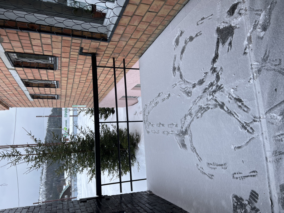 A brick building with barred windows stands beside a snow-covered surface. Footprints crisscross the snow. A dark metal railing partially obscures a view of a snowy landscape with trees. A small evergreen tree sits between the railing and a building across the way. The scene is overcast and appears to be in a mountainous area. The image is rotated.