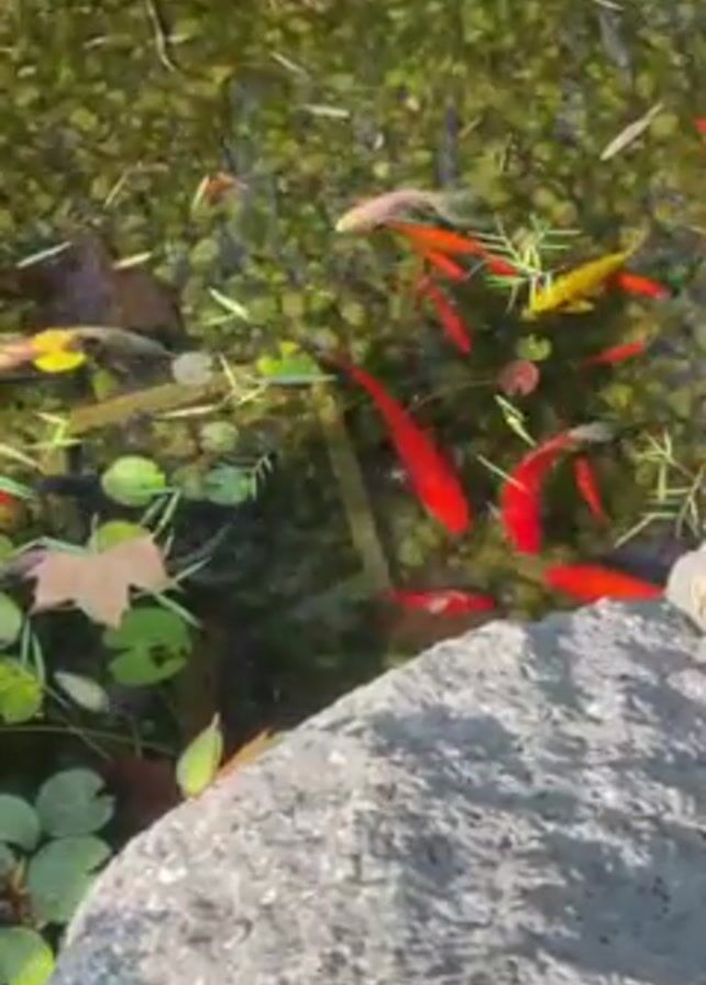 pond with red, yellow, and pink fish swimming among water lilies and fallen leaves. A gray rock is in the foreground. People are talking in the background.