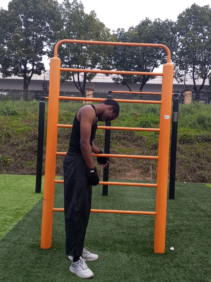 The scene depicts an outdoor fitness area in Jiangjin, China. A dark-skinned adult male is standing on green artificial turf, positioned with his body turned slightly left, leaning forward with his head down. He wears a black tank top, black athletic pants, black fingerless gloves, and light grey athletic shoes. His gloved hands rest on the lowest horizontal rungs of a bright orange metal exercise apparatus, which consists of two main vertical posts and five visible horizontal bars. Partially visible black vertical posts are present adjacent to the orange structure. In the midground, a sloped area covered in green vegetation is visible. In the background, a multi-tiered concrete structure, likely a bridge or overpass, runs horizontally, partially obscured by a dark metal fence with barbed wire and several large green trees. The sky is uniformly overcast.