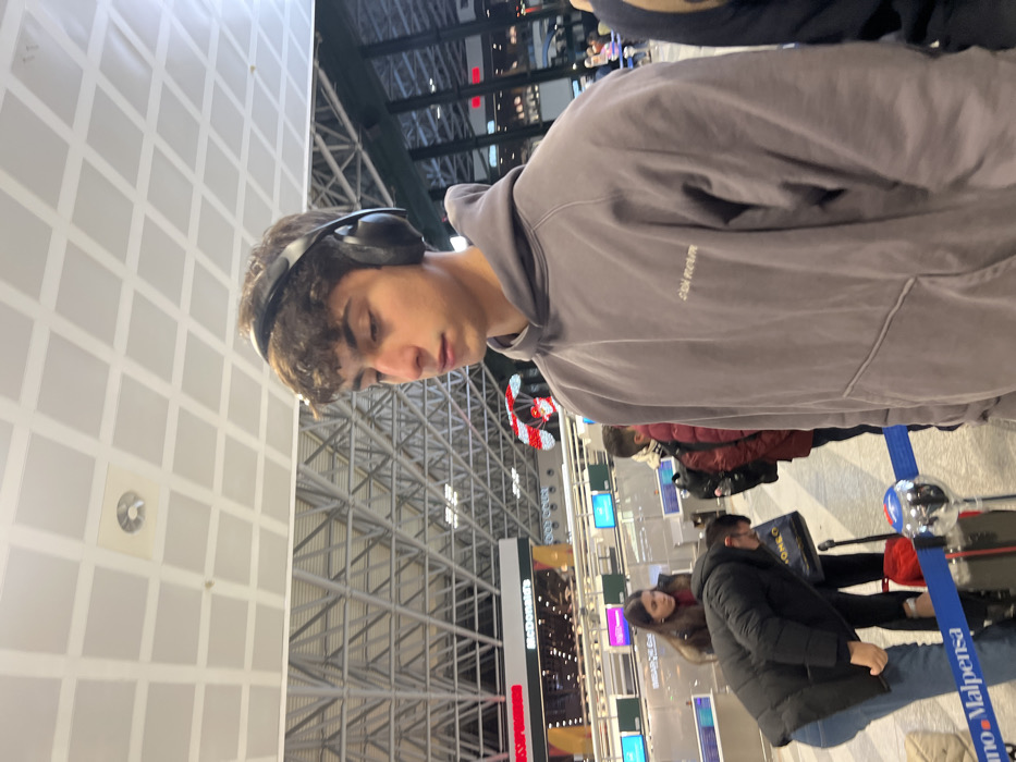 A young man wearing headphones and a hoodie stands in what appears to be an airport terminal