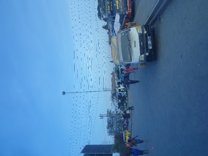 A street scene shows vehicles lined along a curb, including a white truck with license plate KBK 820R and a bus. People are walking on the street and sidewalk. Overhead street lighting is visible against a sky that fades from light to dark blue. The photo's orientation is rotated ninety degrees.