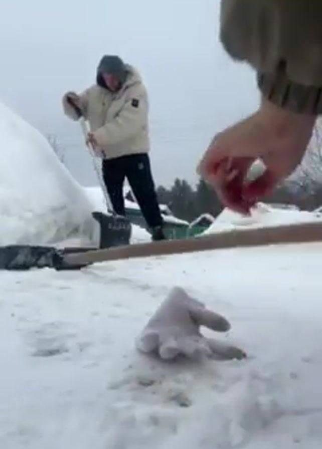 Two people are shoveling snow, with one wearing a white puffy jacket and black pants, and the other wearing a dark green jacket and pink pants. Both are shoveling snow from what appears to be a driveway. The ground is covered in snow. In the foreground, a pair of light-colored gloves lie on the snowy ground. There's a large pile of snow to the left of the people, and trees are visible in the background. The sky is overcast.