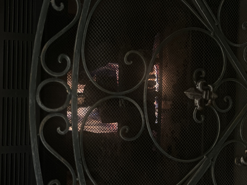 - "A dark metal fireplace screen, adorned with swirling ornamental patterns and a tight mesh, partially obscures the view inside the fireplace" by FM-2bnDB3, licensed under CC BY 4.0