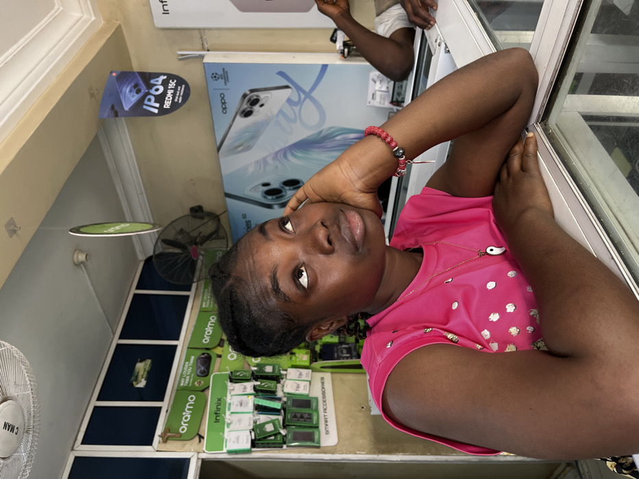 A woman with dark skin and braided hair rests her head on her hand near a glass display case. She is wearing a pink shirt and has a Yin Yang necklace. Behind her are advertisements for OPPO and Redmi 15C phones. Below, on the shelves, are signs for "oraimo" and "Infinix," along with accessories. A fan is visible in the bottom left, and another hangs from the ceiling. The scene takes place inside a shop, potentially a mobile phone store.