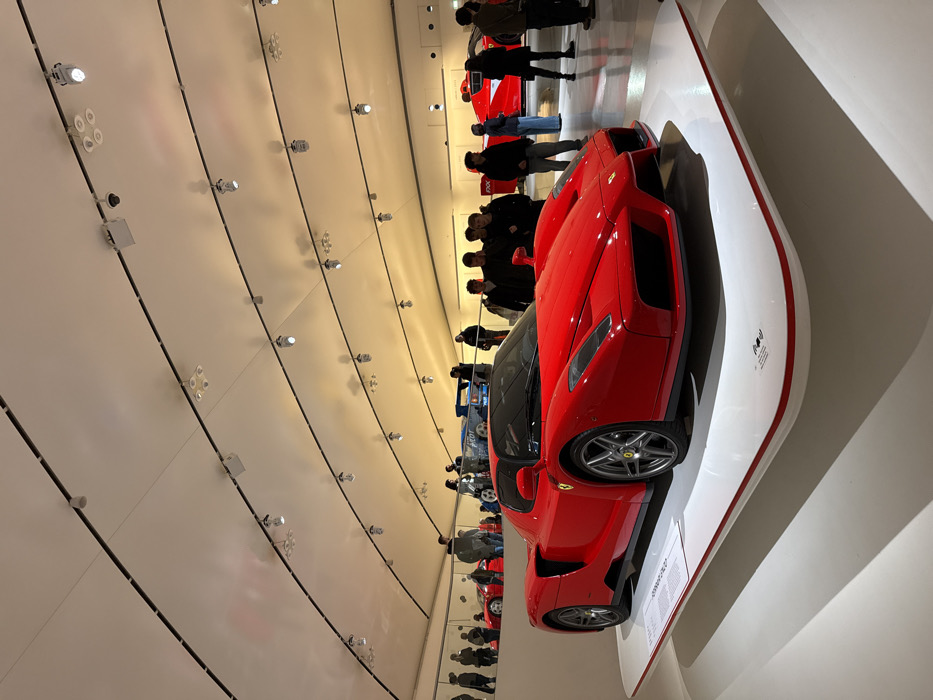 The image displays the interior of the Museo Enzo Ferrari in Modena, Italy
