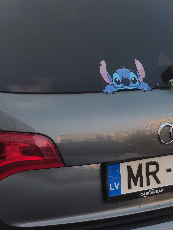 The image displays the rear section of a dark grey Audi vehicle, parked in an urban environment in Riga, Latvia. A blue and pink vinyl decal depicting the character "Stitch" from Disney's *Lilo & Stitch* is affixed to the lower edge of the rear window, positioned as if peeking over the trunk lid. The vehicle's trunk surface reflects indistinct multi-story buildings and a muted sky. A portion of the red left taillight is visible. On the lower right, a Latvian license plate is mounted, featuring the blue EU strip with "LV" and partial characters "MR -". A black frame below the plate reads "CARCARE.LV". No individuals are present.