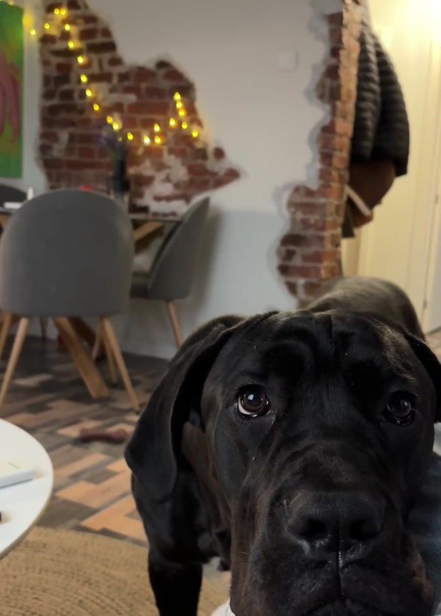 A close-up shot shows a large, black dog, possibly a Cane Corso, standing next to a person sitting on a couch. The dog looks directly at the camera with soft, expressive eyes. The dog then stretches and yawns. The person's legs, clad in blue jeans, are visible in the foreground, resting on a white furry blanket. Behind the couch is a round, white table with some items on it. The room features a decorative exposed brick wall with string lights, and a dining area with grey chairs is partially visible. The floor is covered in a light-colored rug. A doorway is partially visible in the background, with a jacket hanging near it.