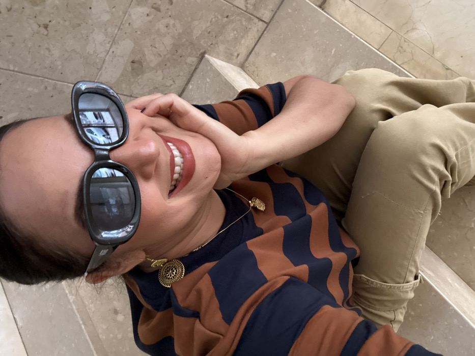 A woman is depicted sitting on light-colored, polished stone steps in Mislata, Spain, smiling broadly and looking upward towards the camera. She wears dark oval sunglasses reflecting a white vehicle and urban architecture. Her dark hair is pulled back. She is dressed in a navy blue and rust-brown horizontally striped short-sleeved shirt and khaki-colored pants. Her left hand is positioned under her chin, resting on her jawline. Accessories include gold-colored circular dangle earrings and a thin gold-colored chain necklace with a small, textured, gold-colored pendant. Her lips are coated with a reddish-brown lipstick.