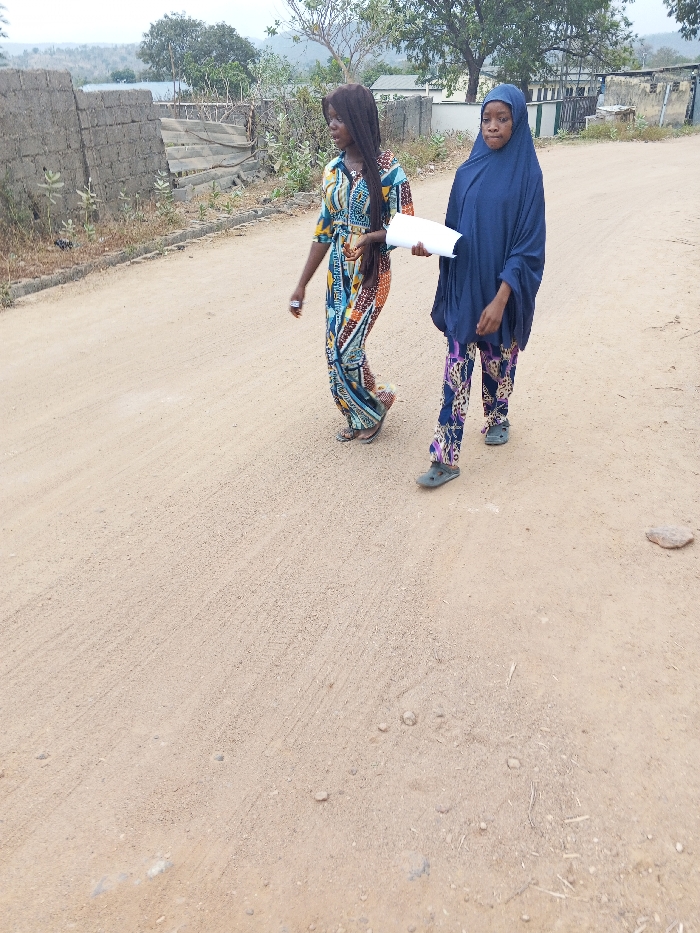 Two women are walking on a dirt road. The woman on the left has long dark hair and is wearing a colorful patterned dress and sandals. The woman on the right wears a dark blue hijab, colorful patterned pants, and sandals; she is holding a white paper or document. Behind them is a block wall, some greenery, and a building in the distance. The road takes up most of the frame, and the background is somewhat blurred.