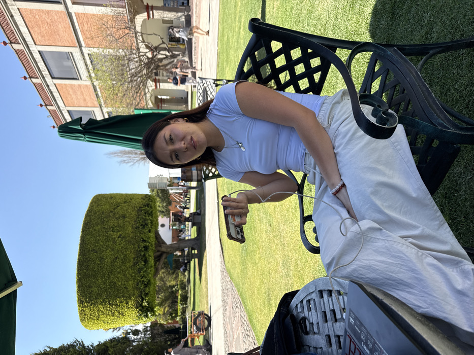 The image displays an outdoor scene on a sunny day at the Universidad de las Américas Puebla (UDLAP) campus in San Andrés Cholula, Mexico. A young woman with dark hair and a light complexion is seated in the foreground on a dark metal lattice-back chair. She is dressed in a light blue short-sleeved t-shirt and light-colored, wide-leg trousers. She wears two silver necklaces with pendants, hoop earrings, and a red and white beaded bracelet on her right wrist. Her left hand holds a smartphone horizontally, connected by a white cable, presumably to an open black laptop resting on a circular metal slatted table to her immediate left. The woman's gaze is directed towards the viewer with a neutral expression. In the midground, a well-maintained green lawn is visible, along with a prominent tree featuring a distinctively trimmed, cylindrical topiary canopy. Behind the lawn, a paved walkway extends. The background features a multi-story red-brick building with large windows and white arched columns, characteristic of the UDLAP architectural style. Several other individuals are present in the background, either walking or standing. To the far left, a person wearing light work overalls is pushing an orange-wheeled utility cart on the paved path. Two large green patio umbrellas are also visible, one partially at the top left and another, folded, to the right of the main subject. The scene is illuminated by strong natural sunlight, casting distinct shadows.