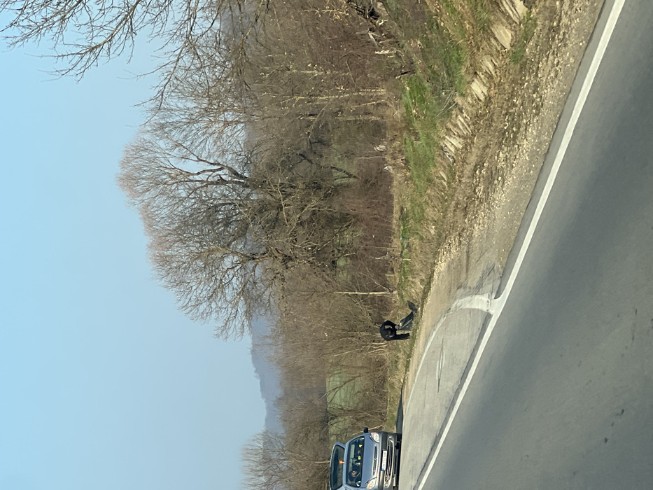 The image depicts a roadside scene located in or near the city of Sopot, Bulgaria, under a clear, light blue sky, indicating daytime conditions. A two-lane asphalt road, marked by a solid white edge line, curves gently into the distance from the lower left foreground. A silver hatchback vehicle, possibly a Citroën Xsara Picasso, is parked on the right shoulder of the road, facing away from the viewer. Its rear driver's side door is open, and an orange object, potentially a hazard triangle, is visible on its roof. Two individuals are seated in the front of the parked vehicle, their features indistinct. To the immediate right of the parked vehicle, on the grassy verge bordering the road shoulder, one individual dressed in dark clothing (dark jacket, dark trousers) is observed bent over. This individual is interacting with a dark, elongated object or bundle resting on the ground. Their posture suggests they are lifting, arranging, or examining the object. The roadside features dry grass mixed with patches of green vegetation. Beyond the immediate shoulder, an embankment with visible concrete or stone erosion control elements is present. Further into the background, a dense line of bare deciduous trees and shrubs, characteristic of winter dormancy, separates the foreground from a lighter green field. Distant, indistinct hills or mountains are visible under the clear sky.