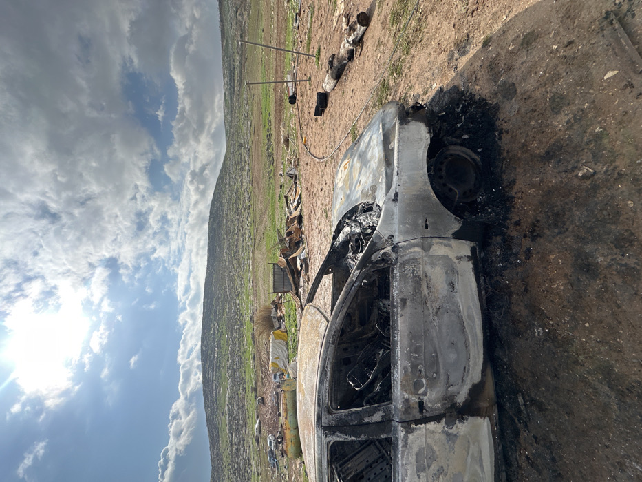 This image depicts a scene in Mikhmas Bedouin, Palestinian Territory, under a partly cloudy sky with bright sunlight. In the immediate foreground, a heavily burned-out four-door sedan is positioned on a dirt patch, angled slightly toward the right. The vehicle's exterior is extensively blackened and charred, with white ash residue on its surfaces. All windows are absent, and the interior is visibly incinerated, exposing skeletal seat frames and melted components. Black soot and melted material stain the reddish-brown earth directly beneath and around the car. To the right of the vehicle, the ground is unpaved and scattered with debris, including two thick, cut logs and several smaller dark objects that appear to be tires or tire fragments. A dark, flexible hose or cable snakes across the ground toward the midground, where two upright metal poles stand. Further in the midground, a collection of miscellaneous items is visible. This includes what appears to be the remnants of a destroyed structure, characterized by crumpled and rusted corrugated metal sheets and other debris. To the left of these remnants, a large, cylindrical, yellow-painted container lies horizontally, partially obscured by other materials, including white tarpaulin-like fabric. In the far left background, several other vehicles, appearing disused or abandoned, are clustered on the sloping terrain. The background features rolling hills covered in sparse green vegetation and exposed rock, indicating a semi-arid landscape. The sky above is dominated by a mix of blue patches and large, fluffy white clouds, with the sun brightly positioned near the upper center of the frame. No individuals or active interactions are present in the scene.