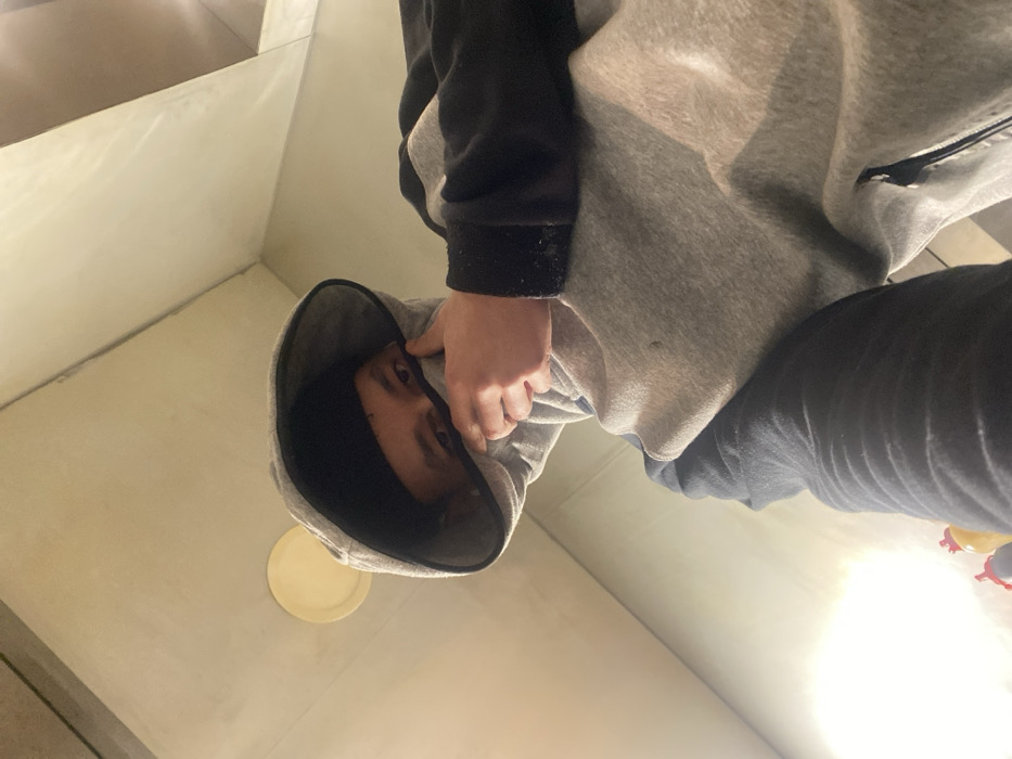 A person wearing a gray and black hoodie with the hood up peers downward. Their hand obscures part of their face. The room has a light, almost sterile appearance, with light walls. A round, light-colored object, possibly a plate, is on the wall. Part of what appears to be black pants is visible. The photo's orientation gives the impression of looking up at the person.