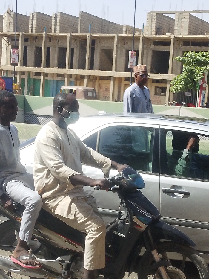 The image depicts a daytime street scene in Tarauni, Nigeria. In the foreground, a dark-complexioned male motorcyclist, wearing a light beige tunic and trousers with a light blue surgical mask, operates a black and silver Lifan scooter-style motorcycle. A dark-complexioned male passenger, wearing a light grey tunic and trousers with red and black flip-flops, rides pillion behind him. Both individuals are looking forward and slightly to the left. To the right of the motorcycle, a silver sedan is partially visible. Standing next to the car, on what appears to be a raised median, is a dark-complexioned adult male wearing a light blue traditional tunic, a patterned light brown cap, and glasses. Inside the car, a dark-complexioned individual in a green garment is visible as a reflection in the passenger side window, with a hand near their face. In the mid-ground and background, multiple multi-story concrete structures are under construction, showing exposed rebar and unpainted concrete block walls. Two black poles with red political campaign banners are situated in front of these buildings. A green and white/light blue low barrier or median separates the immediate foreground from the background. Further back, a light brown three-wheeled auto-rickshaw is partially visible, and a tree with green foliage stands on the far right. The scene is brightly lit by natural sunlight.