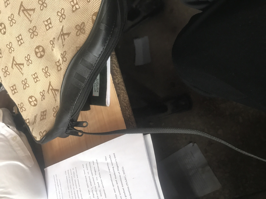 This indoor scene, located in Agwala, Nigeria, depicts a workspace from a seated, first-person perspective. On a wooden desk surface, a stack of white papers is visible, detailing information related to African seed production, referencing "Seed Co Nigeria" and "NASC, 2022." Positioned to the right of the papers is a cream-colored bag with a repeating dark brown monogram-style pattern, featuring black faux leather trim, a zipper with two pulls, and a dark gray fabric strap extending downwards. Partially beneath the bag, a dark notebook with a white label reading "Learning The more you grab from it" is discernible. In the upper left background, a folded white garment is out of focus. Below the desk, the dark-trousered legs of an individual are visible, resting on a dark floor where a dark shoe is also partially present.