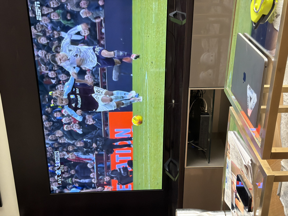 A TV displays a soccer match between Aston Villa and Manchester United, showing two players vying for the ball