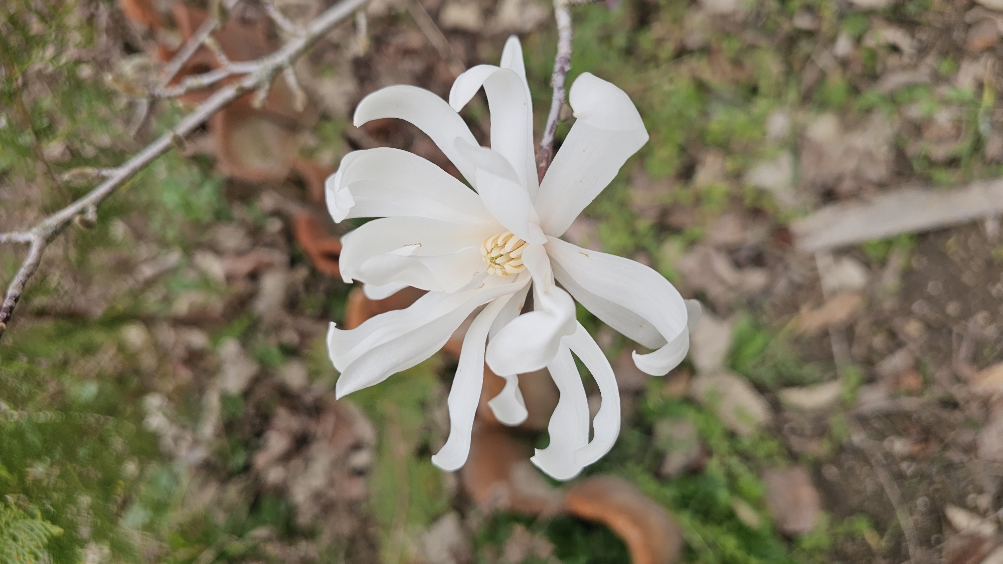 white star magnolia flower in bloom. The flower is centered in the frame and its petals are fully open. In the background, there is a blurred mix of brown leaves, green moss or grass, and some terracotta-colored objects that might be broken pots. A thin, bare branch of the tree is visible in the upper left corner. The location is specified as Beguntsi, Bulgaria, but there are no visible elements in the image that directly confirm that specific location.