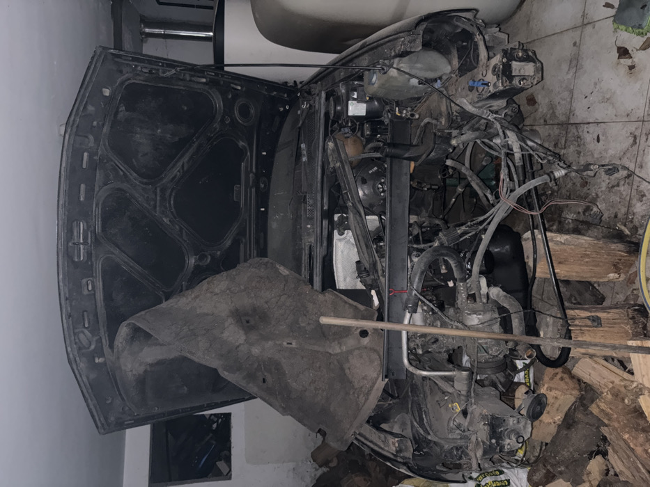 A dark-colored vehicle, likely a sedan or hatchback, is depicted in a significant state of disassembly within an indoor garage or workshop located in Vila Real, Portugal. The car's hood is fully open, revealing a dark, ribbed underside and a large, dirty fibrous insulation pad hanging down from its attachment points. The engine compartment is largely exposed, lacking its front bumper and possibly fenders, showcasing the internal frame, various hoses, electrical wiring bundles, and visible mechanical components. A horizontal black metal bar is positioned across the upper section of the engine bay. On the left side, a light-colored wooden pole leans against the car's front structure, extending towards the floor. The floor is tiled and heavily soiled with dirt, grime, and debris. In the lower-left, several wooden logs and cut blocks are stacked, some potentially serving as makeshift supports. In the background to the right, two large, light-colored cylindrical objects are visible, with one featuring a prominent vertical metallic flue or pipe. To the upper left, a small, rectangular, dark opening or window reveals a cluttered, unidentifiable interior space. The walls are painted white but appear aged or stained. The scene is illuminated by artificial light sources, casting subtle shadows and indicating an enclosed environment. No individuals are present in the image.