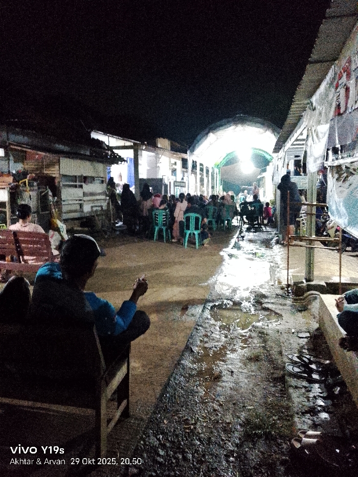 This nighttime image depicts an outdoor social gathering in the city of Unknown, Indonesia. The scene is artificially illuminated, primarily by a brightly lit, large white arched canopy in the center-background, under which numerous individuals are gathered. Approximately 20-30 people are visible, predominantly seated on light-green plastic chairs, engaged in various states of interaction. In the immediate foreground, a person with their back to the camera, wearing a blue long-sleeved shirt and a dark cap, is seated on a wooden bench, holding a small white object in their raised right hand. Another person is partially visible on a similar wooden bench to the left. The ground in the foreground is a relatively dry, packed dirt or concrete surface. Extending from the foreground towards the arched canopy is an uneven dirt path, characterized by numerous puddles and wet areas. Along the right side of this path, a low concrete ledge displays a collection of assorted sandals and slippers, next to which a person is partially visible, sitting barefoot. Structures within the scene include informal buildings constructed from corrugated metal and wood on the left side, some appearing rudimentary. On the right, a covered walkway or structure is adorned with hanging fabric banners or tarps. The overall environment suggests a community event occurring in a semi-rural or informally developed urban area.