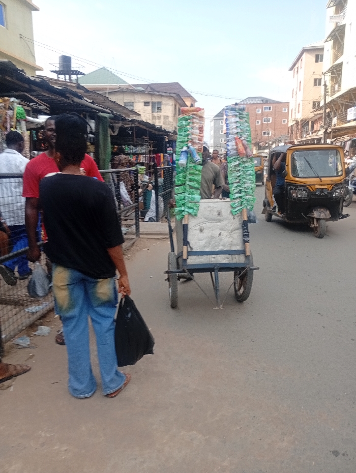 A bustling street scene captures the vibrant activity of a market area. A man in a black shirt and blue jeans holds a black bag. A two-wheeled cart laden with snacks in colorful packaging stands nearby. An auto rickshaw approaches on the right. Buildings line the street, and other people stroll around, adding to the lively atmosphere of the scene.