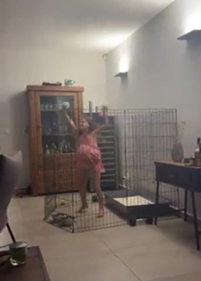 In a medium shot, a young girl in a pink dress is inside a large metal dog pen in a living room
