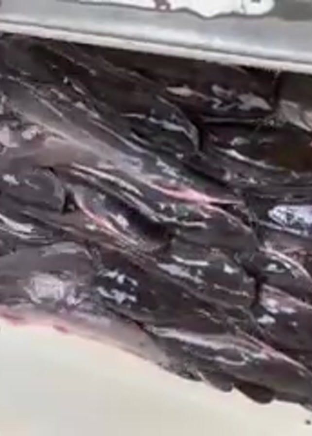 A metal container, possibly a trough, is filled to near overflowing with a large quantity of live catfish. The catfish are dark, with slight pinkish tints on their undersides. The container is white and appears to be outdoors. The catfish are moving and writhing within the container. Background sounds indicate a busy environment with voices and possible traffic noise.