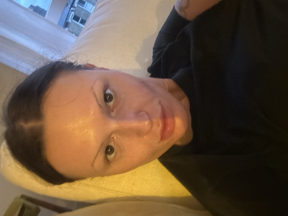 A female subject, approximately 20-40 years of age, with dark hair parted in the center and pulled back, is depicted in a head-and-shoulders, direct-to-camera portrait. Her face shows minimal makeup, with light eyebrows and full lips. She is wearing a dark, possibly black, t-shirt or top. She is positioned indoors, leaning against pale upholstered furniture; a textured yellow surface is visible on the left and a lighter, smoother surface on the right. In the background, through a window on the right, an overcast sky is visible above a brick building with white-framed windows, consistent with residential architecture found in London, United Kingdom. A portion of a tattoo is visible on her right upper arm.